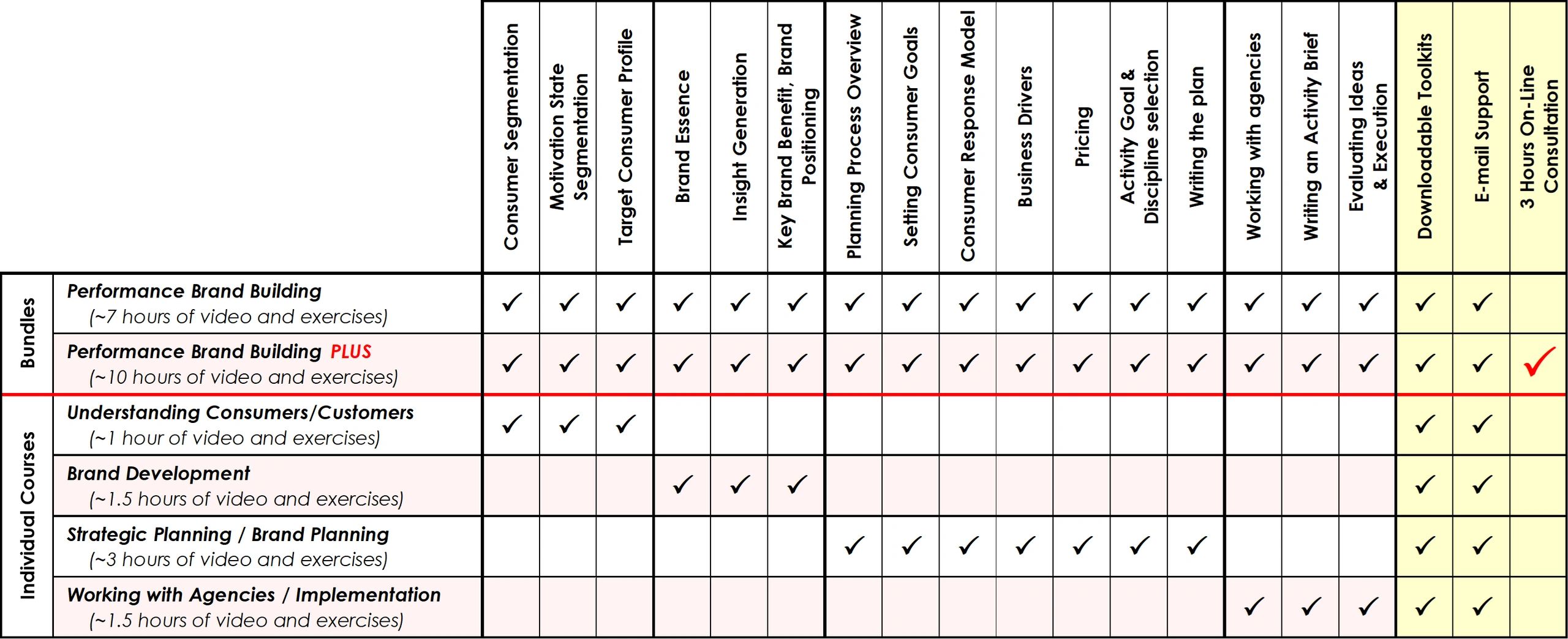 The Performance Brand Building PLUS bundle comes with 3 hours (cumulative) of live, one-on-one, support for course question and clarification or consultation.